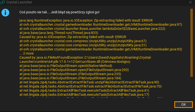 Wyłącz launcher i usuń folder C:\Users\Dawid\AppData\Roaming\Crystal-Launcher\runtime\64\jdk-17.0.1+12
