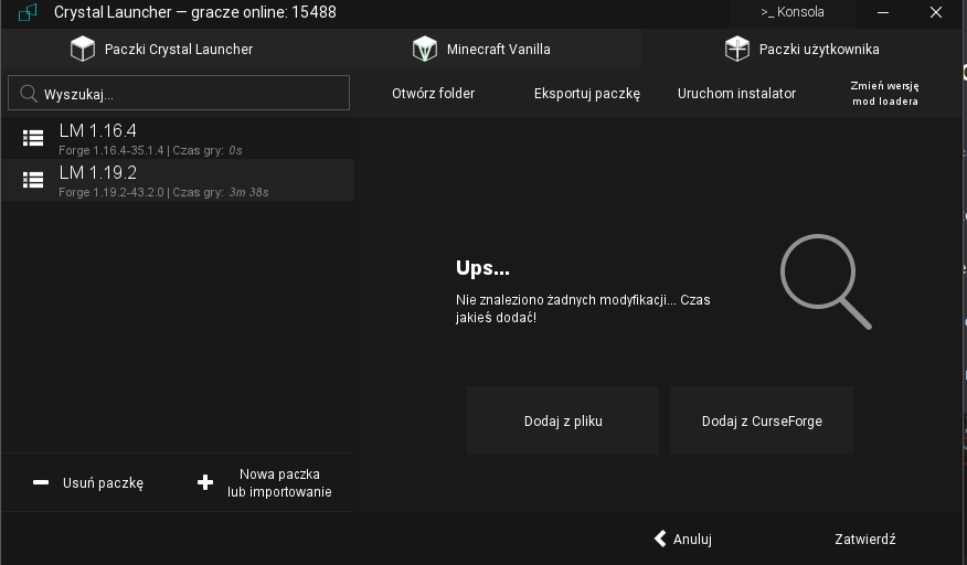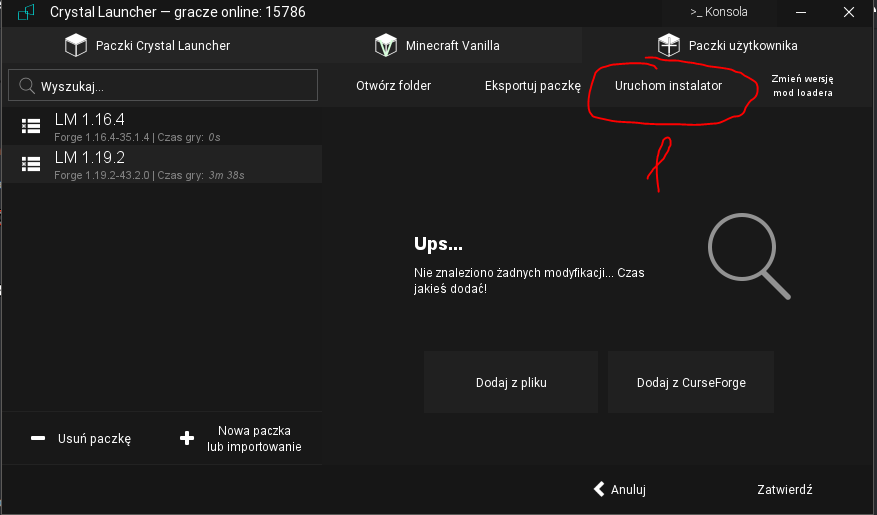- Zainstalowałem forge przez instalator z crystala (wszystko działa)